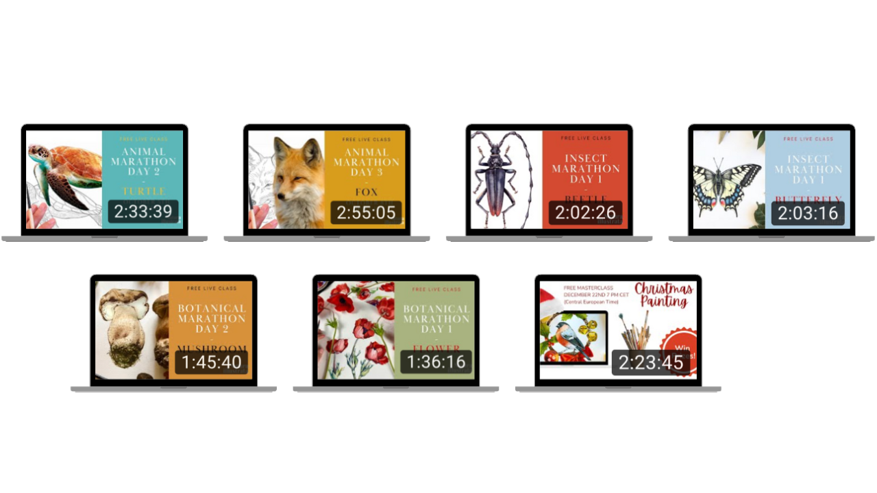 This is your exclusive offer to get lifetime access to 7 Painting Masterclasses where I will guide you through a comprehensive step-by-step process of painting 7 natural subjects (sea turtle, fox, shiny beetle, butterfly, mushroom, flower, Christmas composition). Each Masterclass is approximately 2 hours long, and the total duration of the masterclasses is over 14 hours.